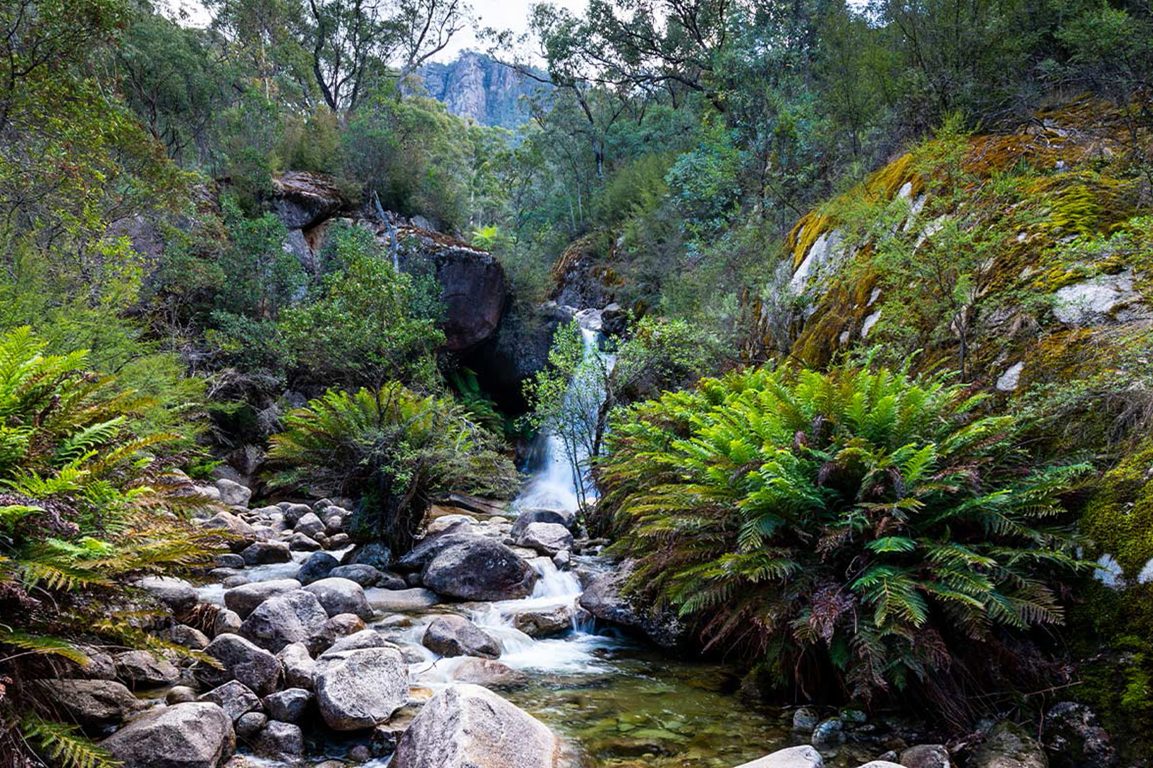 From the Eurobin Falls car park, a well-formed trail leads first to Ladies Bath Falls — a small but inviting waterfall where cool water flows into a shallow rock pool. Local legend says the pool was once a bathing spot for ladies visiting the mountain in the early 1900s. Continue along the track for another 500 metres to reach Lower Eurobin Falls, where water tumbles dramatically over smooth granite rock faces.