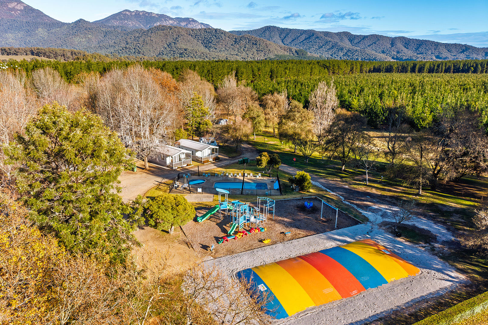 The playground is just one of the many features at Bright Porepunkah Holiday Park that make it the perfect base for your High Country getaway. When the kids are done climbing, they can jump on the giant jumping pillow, race around on pedal karts, or cool off in the solar-heated pool.